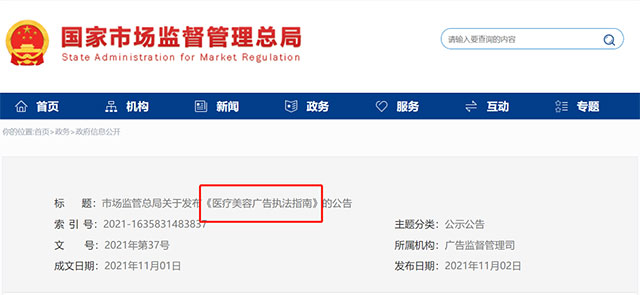 11月2日,市場監管總局發布《醫療美容廣告執法指南》(以下簡稱《指南》)。《指南》旨在為地方各級市場監管部門加強醫療美容廣告監管工作提供指引,切實規范和加強醫療美容廣告監管,有效維護醫療美容廣告......
