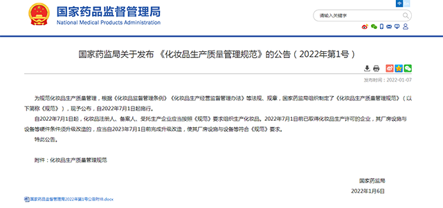為規范化妝品生產質量管理,根據《化妝品監督管理條例》《化妝品生產經營監督管理辦法》等法規、規章,國家藥監局組織制定了《化妝品生產質量管理規范》(以下簡稱《規范》),現予公布,自2022年7月1日......