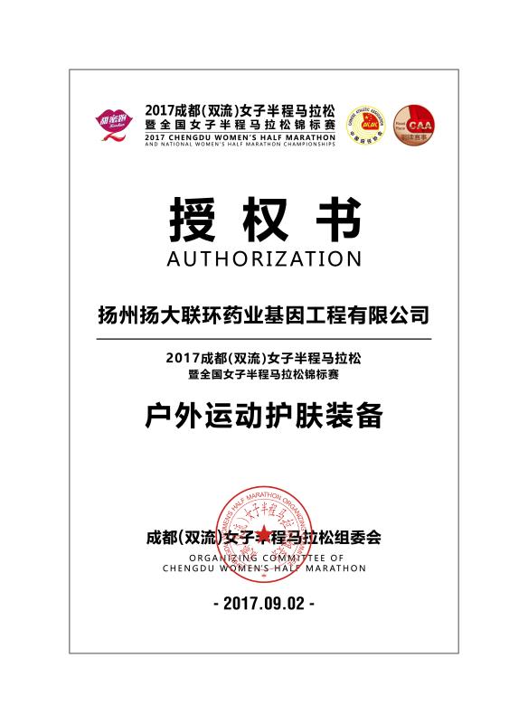 揚州揚大聯環藥業基因工程有限公司旗下運動護膚裝備'SOLOLAND索諾蘭',2016年成為女子半程馬拉松——KISS RUN賽事合作護膚裝備,并成功贊助了2016年成都女子半程馬拉松、2017年南京浦口國際女子半程馬拉松。金秋九月,索諾蘭再度助跑2017年成都雙流女子半程馬拉松,向參賽者提供舒緩面膜和噴霧,全程貼心的賽事服務滿足了參賽者運動后皮膚損傷的護理需求,豐富其參賽體驗。