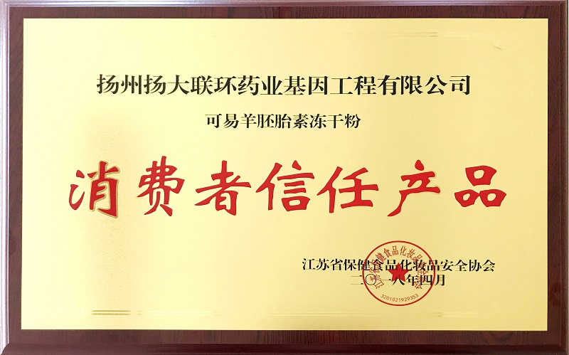 4月28日,江蘇省保健食品化妝品安全協會一屆三次會議暨“誠信自律 進行業健康發展”高峰論壇在南京順利召開。會議對在省保化協會“創建誠信銷售示范企業”和“消費者信任產品”活動中獲獎的單位予以表彰并進行了授牌。揚州揚大聯環藥業基因工程有限公司“可易羊胚胎素凍干粉”榮獲“消費者信任產品”稱號。