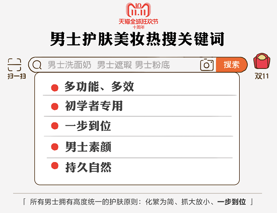 天貓“雙11”《中國男性好色報告》顯示,中國男性正在變得越來越“精致”,他們花費在護膚、理容、美妝上支出越來越多,95后男生買彩妝,90后男生愛護膚,80后男生在養發……像是蜜粉、脫毛膏、生須液等單品同比增長均超過200%。